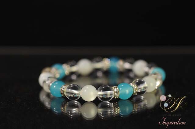 シーブルーカルセドニーAAA8mm、ムーンストーンAA8mm、クォーツAAA8mmの内径約16mmのブレスレッドです。